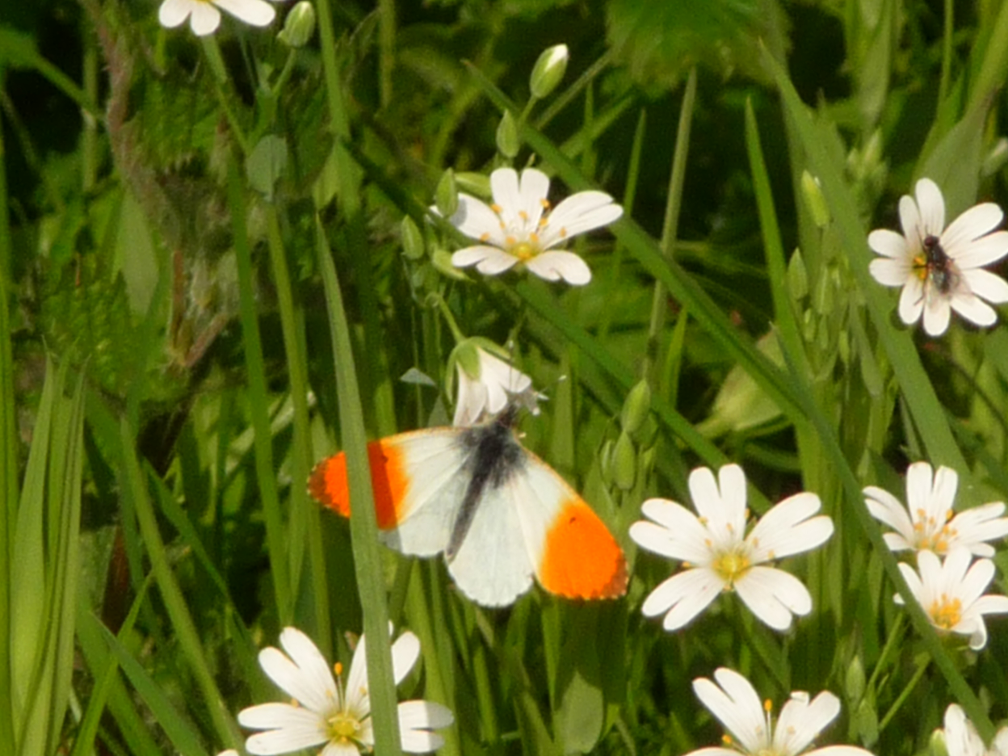 Ook de vlinders zijn van de partij. De oranjetips vliegen lustig tussen de pinksterbloemen -één van hun waardplanten-.