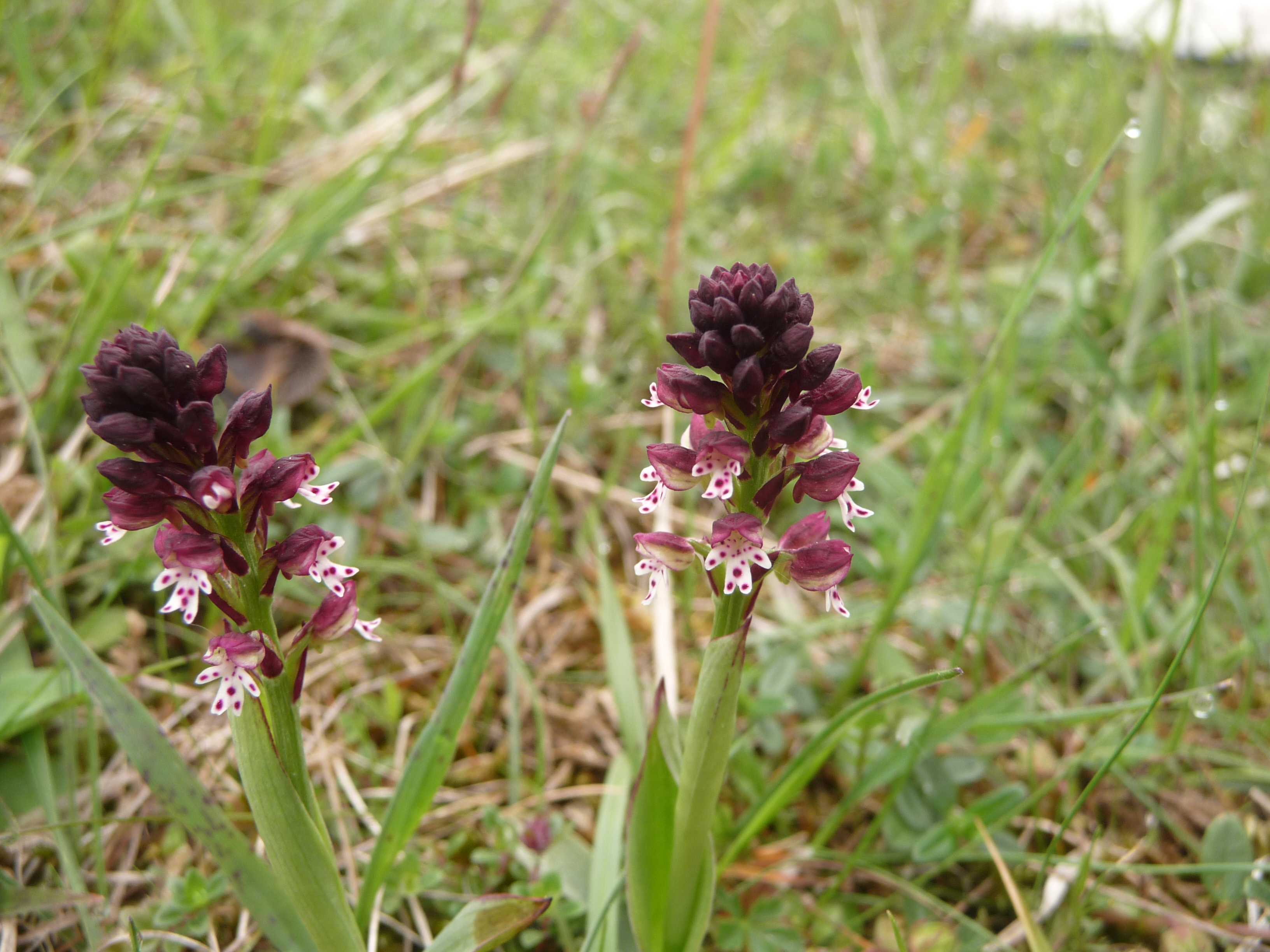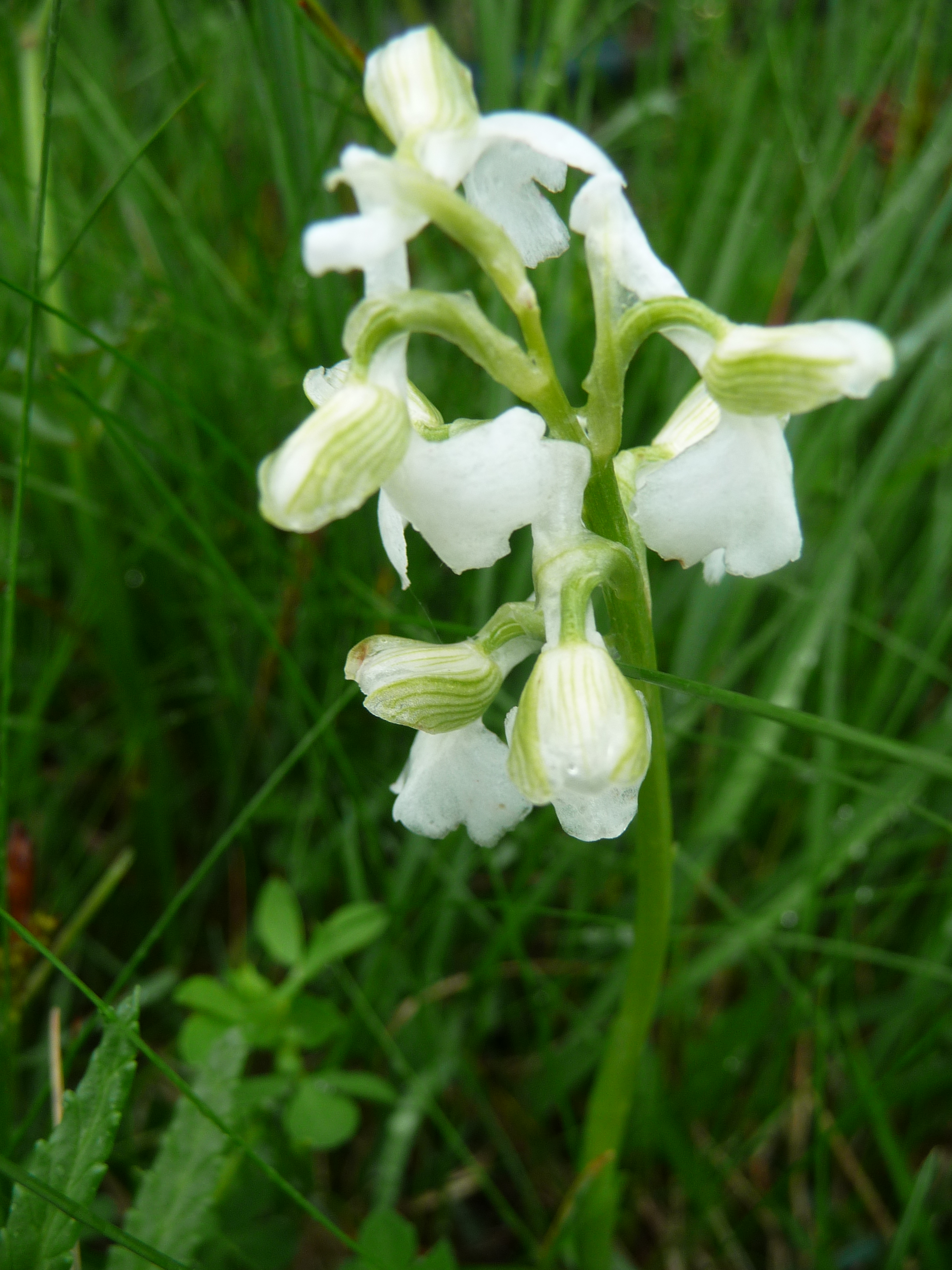 De aangebrande orchis lijkt net een poppetje met een witte pyjama vol met rode stippen…