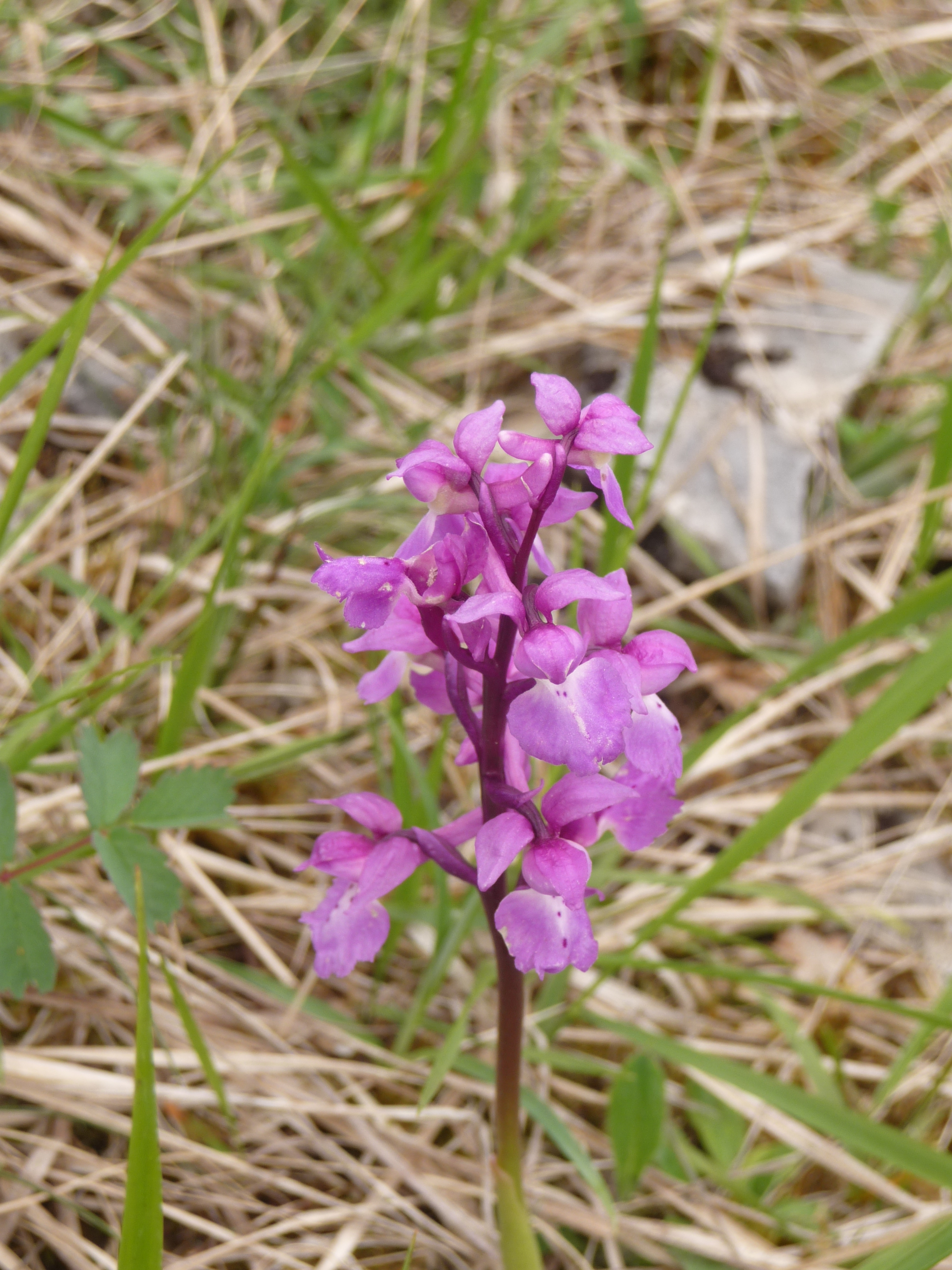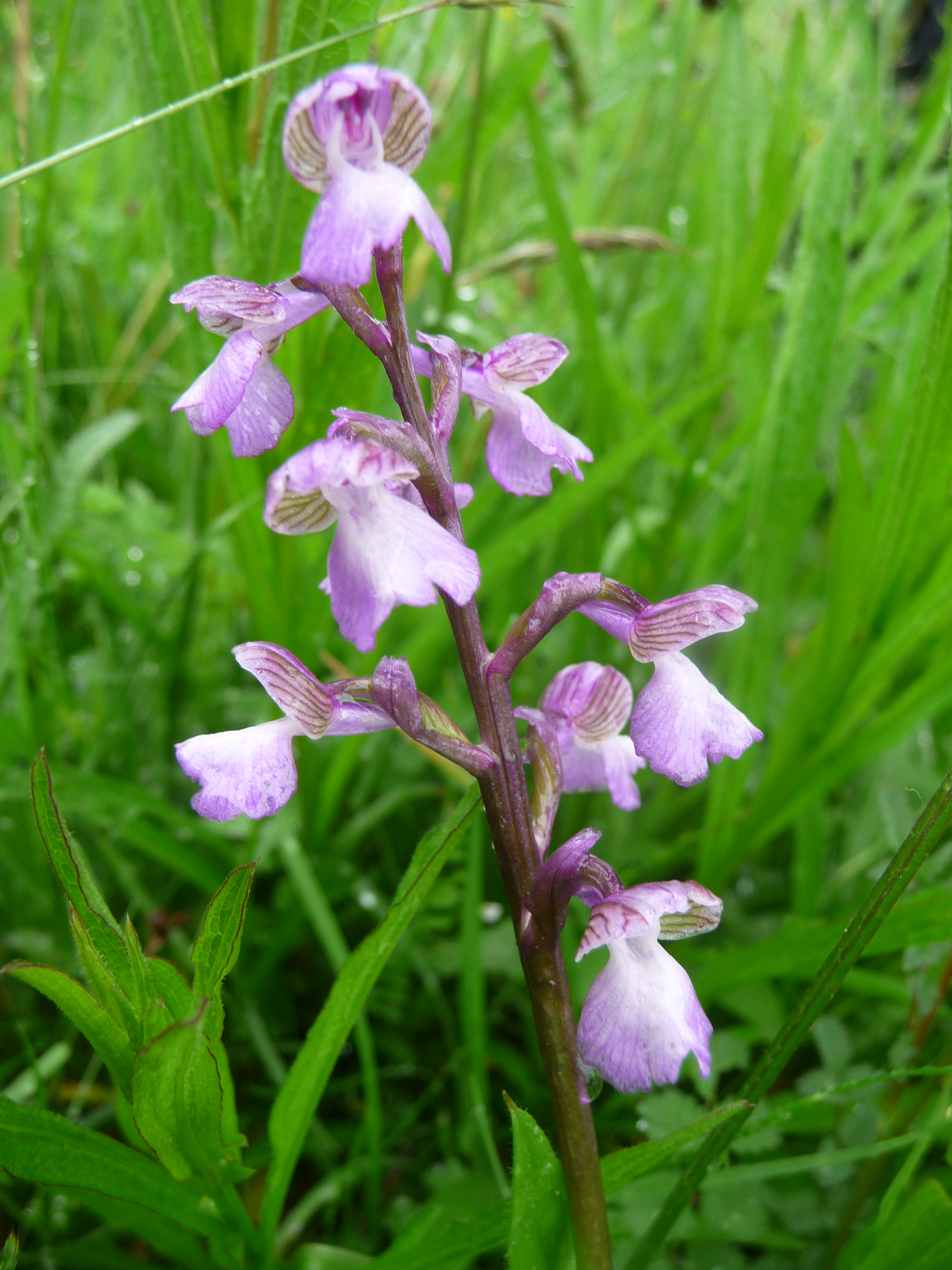 De mannetjesorchis is ook een paarse orchidee. Hij heeft een lang spoor dat schuin omhoog gericht is.